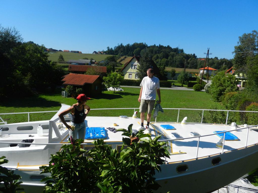 Für die Außenlackierung musste das gesamte Boot abgeschliffen und entfettet werden, eine wunderbare Aufgabe... doch danach kam Farbe ans Alu. Das Deck wurde mit Quarzsand rutschfest gemacht und endlich konnte man auch barfuß an Deck gehen - am blanken Aluminium war das quasi unmöglich sobald die Sonne heraussen war.