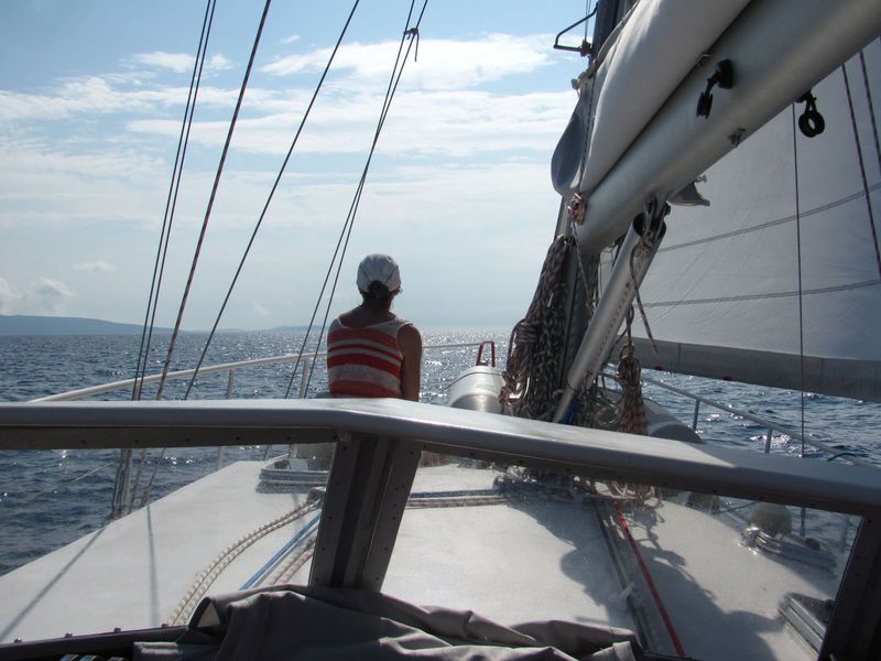 Bis Premuda hielt die Prognose, danach wars wieder vorbei mit Ruhe. Der Wind dreht etwas mehr auf Nord, was für unsere Kurwahl bedeutet, dass wir kreuzen müssen und steigt auf Windstärke 8-10, Seegang 5... das letzte Stück vor Ilovik wurde das Ganze durch den Düseneffekt nochmals verstärkt. Irgendwann wollten wir nicht mehr kreuzen, nehmen die Segel runte und fahren mit Maschine direkt gegenan - das ging zwar, aber sicher nicht schneller. Das Boot stampft in den Wellen, wir werden auf 0-2Knoten Fahrt abgebremst, haben Kavitation am Propeller, es dauert ewig.