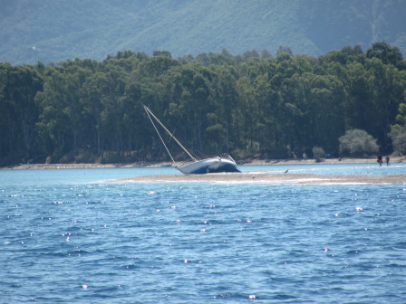 Weiter geht es über Patras - sehenswerte Skyline, sehr belebte Innenstadt - in den Golf von Korinth. Am Weg ein gestrandetes Segelboot, ein trauriger Anblick - eine fiese Sandbarriere war schuld. Einmal nicht genügend auf die Seekarte geguckt, und schon ist es passiert... leider nicht das einzige gestrandete Boot.