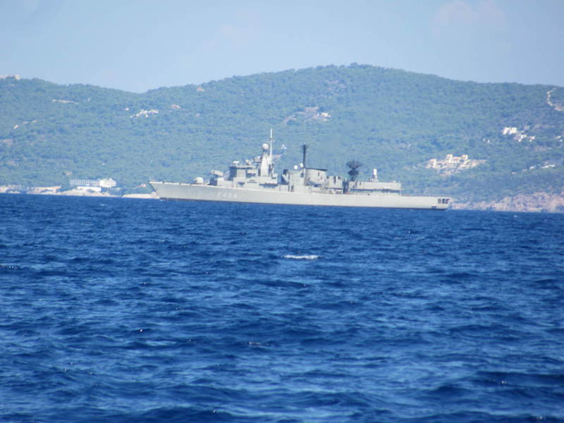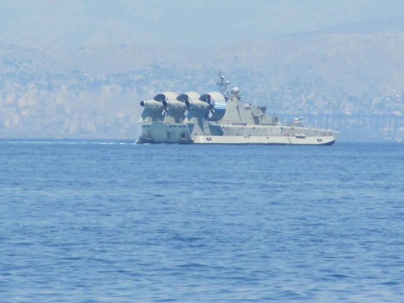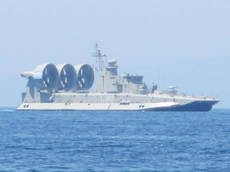 Jede Menge Luftwaffenübungen von NATO bzw. grliechischer Geräte, aber auch am Meer schwimmt etwas Kriegsspielzeug herum, darunter auch ein recht ordentliches Luftkissenboot. Macht einen Höllenlärm, ist bereits aus einigen Seemeilen Entfernung sehr laut und etwas bedrohlich.